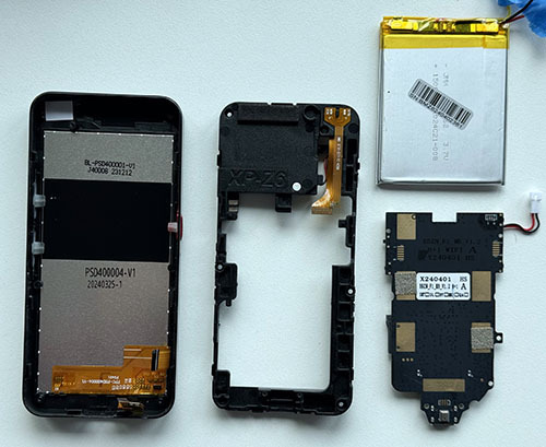 Above are the main parts of the device. The construction is simple and straightforward: big battery, screen with captouch, a rear-facing camera, and a speaker in a large chamber. The speaker chamber is the portion of the plastic mid-case that has the words “XP-Z6” emblazoned on it.