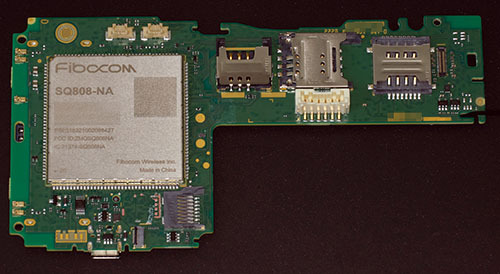 This board design was almost certainly adapted by deleting parts from a reference design with 3G functionality, as evidenced by the footprint of the RF shielding containing blank areas that are just large enough to accommodate the analog front-end (AFE) companion chip required for 3G. You can see some images of such an AFE in a decade-old post I did about reverse engineering an MT6260A, a distant ancestor of the SoC in this device.