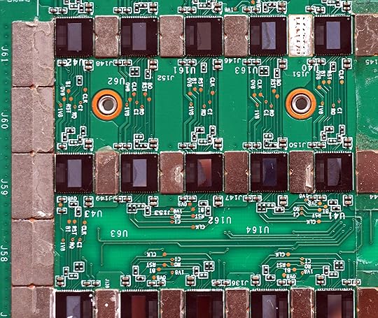 I chose this portion of the miner to share for the ware because it clearly shows the “string of pearls” topology of the miner. Each chip’s ground is the VDD of the chip to the left. So, the large silvery bus on the left is ground, then the next rank is VDD, the next is VDD*2, VDD*3, and so forth, until you reach about 12 volts. The actual value of VDD itself is low – around 0.3V, if I recall correctly. Miners focus on efficiency, not performance, so the mining chips are operated at a lower core voltage to improve computational efficiency per joule of energy consumed, at the expense of having to throw more chips at the problem for the same computational throughput.