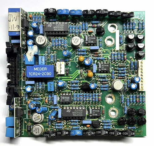The meters, typical in the broadcast world, have two needles against a single scale; the 4 holes in this board are both mounting points and contacts for the two coils. The board takes a pair of balanced audio inputs, and drives the pair of needles with tightly controlled (and calibratable) ballistic profiles such that they indicate and hold audio peaks correctly, rather than giving the typical slower VU meter response. The board lets you switch the meters between showing the A and B input levels, or a Sum and Difference reading (which I’m guessing is the purpose of the two Meder relays).