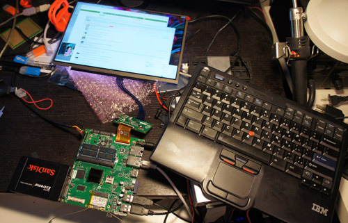 In the meantime, we’ve been developing on the system in an “exploded” fashion. The system below shows all the essential elements together and working; keyboard/mouse, LCD, hard drive, mainboard, hosting its own development environment. The desktop environment shown below is stock armhf Ubuntu with our custom kernel, but that is far from a final decision; we’re testing a broad field of distros for compatibility and convenience.