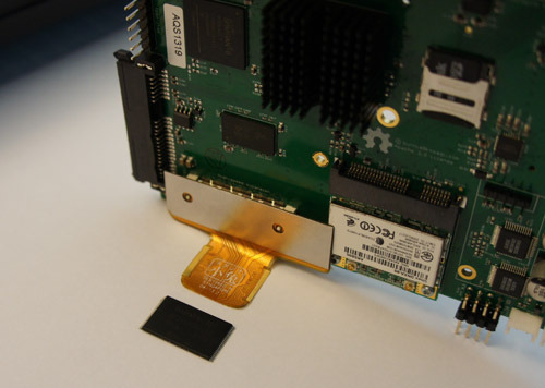A small flexible circuit board adapter plugs into the high speed expansion socket. The board is thin enough to be soldered underneath a FLASH chip for passive monitoring, or directly to the target motherboard for active emulation.