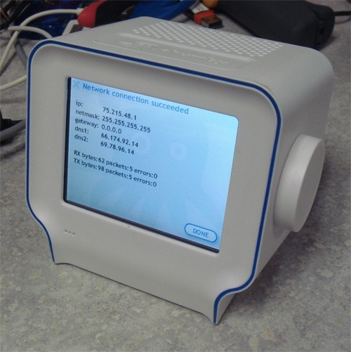 The chumby One contains a concrete example of the impact manufacturing process can have on design outcome. In the original concept art, the blue highlight around the front edge was added to evoke the feeling of a speech balloon, like those used in captioning comics – the idea being the chumby is captioning your world with snippets from the Internet.