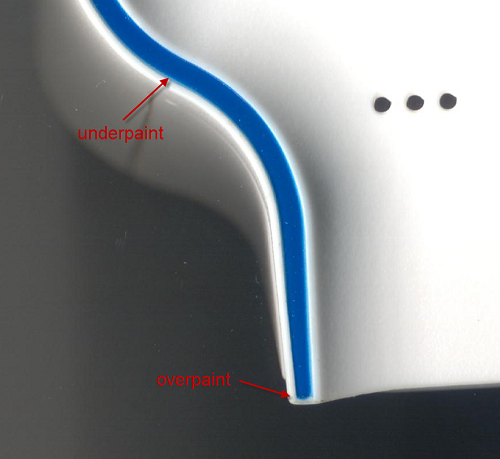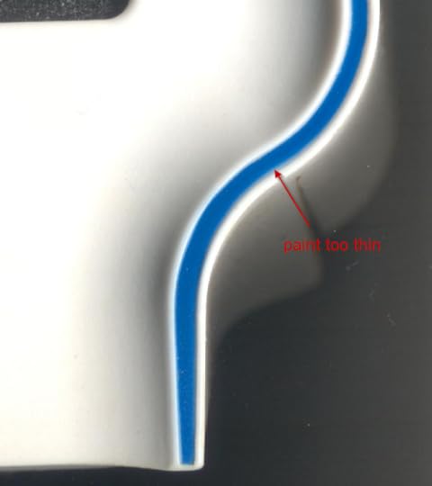 It turns out the implementation of such a blue trim across a raised surface is very hard. At the first factory, we implemented the highlight using paint. Silk screening was not an option because the shape wasn’t flat enough. Pad printing can handle curved surfaces, but the alignment wasn’t good enough, as the tiniest bleed over the edge looked terrible from the side. Decals and stickers likewise could not achieve the alignment required. In the end, a small channel had to be carved to contain the paint, and a stencil plus spray paint process was employed to create the highlight. The yield was terrible – in some lots, over 40% of the cases were being thrown away due to painting errors. Fortunately, plastic is cheap, so throwing away every other case after painting had a net cost impact of about $0.35.