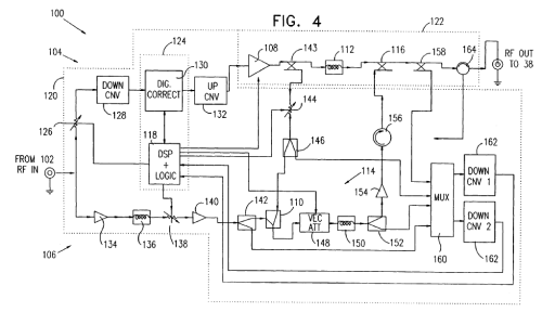 The submitter of the ware notes that there is a patent that is a close hit on this design, see figure 4 of “Super-linear multi-carrier power amplifier“. The PA board is block 108, the digital board is block 124; the rf board, with the 3 downconverters and 1 upconverter, is block 120, with some components connected externally to the board (not seen in the scans) – the delay lines and the error amplifier (154, 156).