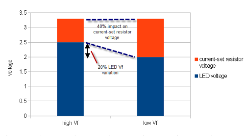 The above chart illustrates how a 20% LED Vf variation leads to a 40% change in the voltage across a current-set resistor for a fixed 3.3V supply, which will in turn lead to a 40% change in the current flowing through the LED, finally manifesting as a 40% change in perceived brightness.