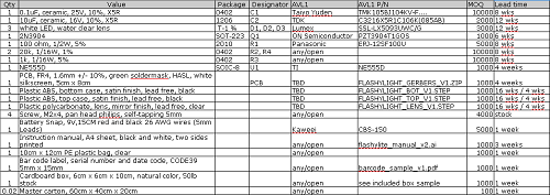 Furthermore, the table above addresses only the electronics BOM. A complete BOM for an LED flasher also needs to include the PCB, battery, plastic case pieces, lens, screws, any labeling (for example, a serial number), a manual, and packaging (plastic bag plus cardboard box, for example). There may also need to be a master carton as a single boxed LED flasher is too small to ship on its own. Although cardboard boxes are cheap, they aren’t free, and if they aren’t ordered on time, inventory will sit on the dock until a master carton is delivered for final pack-out prior to shipment.