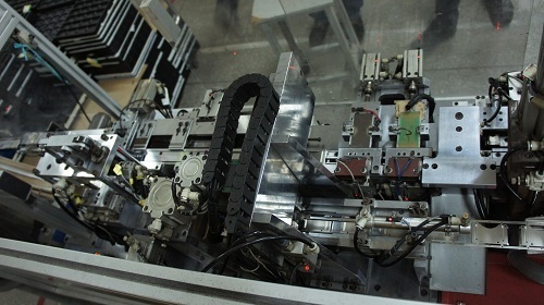 I can stare and watch machines like this operate for hours. I’m particularly fascinated by the vibrating buckets that, through simple shaking motions, takes a random pile of connectors and lines them up. The vibration of the bucket is biased; if you put your hand on the edge of the bucket, your hand will also magically glide in the same direction as the connectors. There are a series of notches and ledges on the internal guide tracks that cause connectors in the wrong orientation to fall back into the bucket, such that by the time connectors reach the top they are all in just one orientation.