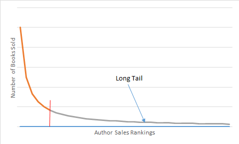 A few authors sell vast numbers of books, while most authors sell very few. If you could amass accurate data on that, it would probably look like a decaying exponential curve. It would have the Pareto property, where 20% of the authors sell 80% of the books—those on the left. However, today we’ll focus on the right side of the curve. Statisticians, with their penchant for arcane, hard-to-understand terminology, call that part “the long tail.”