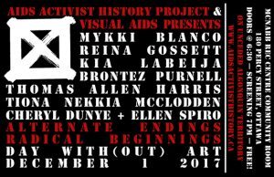 For World AIDS Day / Day With(out) Art on December 1st the AIDS Activist History Project co-hosted a screening put together by the folks at Visual AIDS. We paired the program of new short works by Black American activists/artists provided by Visual AIDS titled ALTERNATE ENDINGS, RADICAL BEGINNINGS with The Colour of Immunity (1991), an early for-and-by Black Canadian HIV prevention tape. The AHHP also produced a blog post foregrounding the work of African, Caribbean, and Black communities in Canada and their struggle against HIV/AIDS as it came up in the oral history interviews we’ve conducted to date.