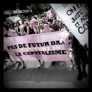 During this year’s Burdock Gathering I co-hosted a workshop and teach-in on the Quebec student strike.  While we were discussing neoliberalism and austerity with the participants we also made a solidarity banner which the three of us who hosted the workshop then marched with at the massive demonstration on August 22nd, 2012.