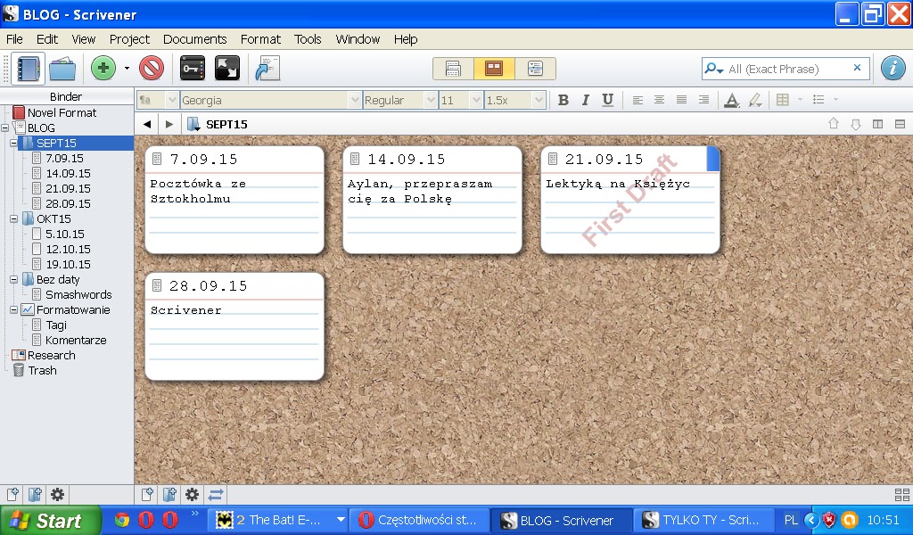 Ściągnąłem sobie wersję próbną, dostępną na 30 dni efektywnego korzystania (czyli dni, w których programu nie otwieramy, się nie liczą). Po tygodniu jednak Scrivener całkowicie mnie do siebie przekonał i go kupiłem. A im dłużej ze Scrivenera korzystam, tym oczywistsze staje się dla mnie, że Word nie jest programem do pisania książek. Już taka drobnostka, że powieść i wszystkie teksty z uwagami na jej temat są w Scrivenerze elementem jednego pliku, daje mu ogromną przewagę. W Wordzie niby też można wrzucić je do jednego folderu, ale różnica jest taka, jak między praniem w pralce automatycznej a ręczną przepierką. To jednak tylko początek. Przerzuciłem pisaną trzecią część Przygodnego do Scrivenera. Mam ją teraz w całości, podzieloną na sceny, a przegląd scen mogę sobie wywiesić na tablicy korkowej i dodatkowo je opisać. Po dłuższej przerwie bez problemu zorientuję się, co i jak, nie będę musiał czytać całości. A tak wygląda ta tablica korkowa z tekstami, które zamieściłem na blogu we wrześniu: