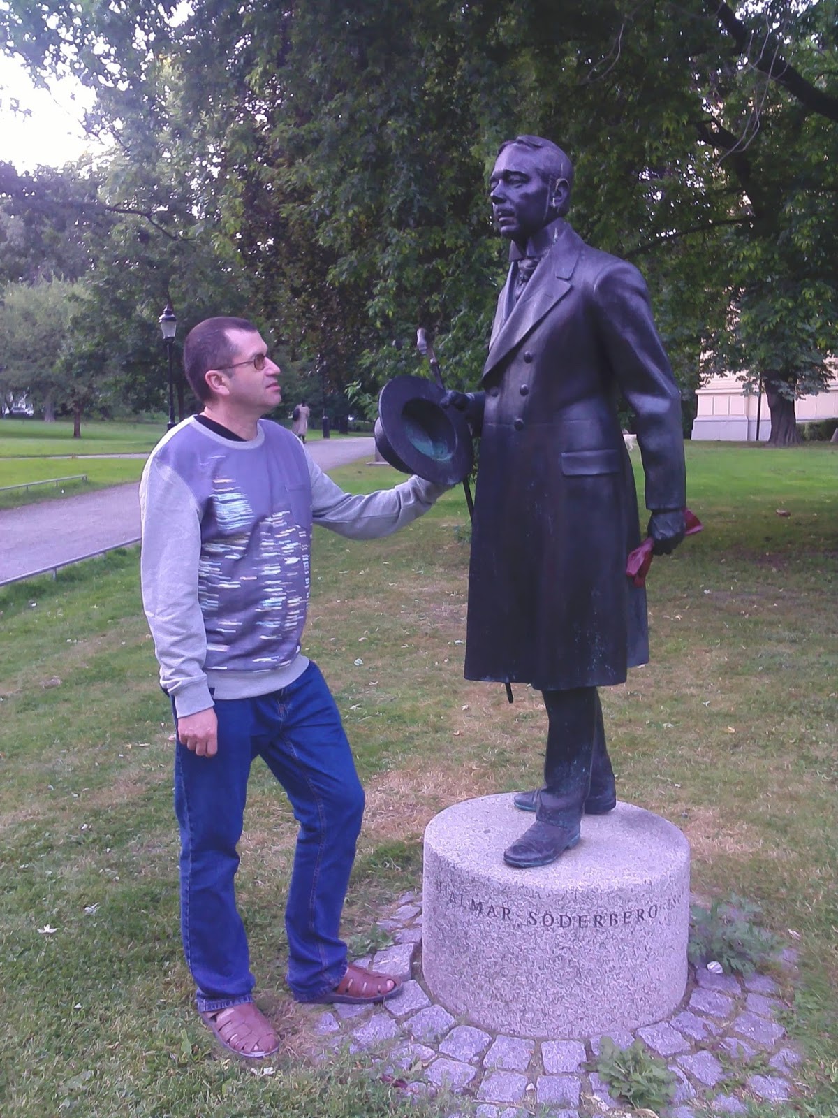 Nowością dla mnie był pomnik Hjalmara Söderberga, którego dotąd nie miałem okazji zobaczyć. Poszukiwania chwilę trwały, bo weszliśmy do Humlegården akurat z drugiej strony i okrążyliśmy całą Bibliotekę Królewską. Koleżanka wytypowała gigantyczną rzeźbę jako tę szukaną, ale to był Linneusz, a ja ze zdjęć pamiętałem, że pomnik Söderberga jest znacznie mniejszy. W końcu znaleźliśmy i mogłem sobie pstryknąć fotkę. Pisarz i jego tłumacz:
