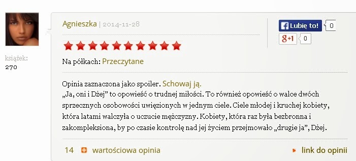I teraz jest wszystko w najlepszym porządku: Aneta Mazur nie jest pracownikiem Psychoskoka, może więc jego książki obiektywnie oceniać jako czytelniczka, a to, że czyta tylko książki Psychoskoka i jest nimi nieodmiennie zachwycona, oceniając je na 9 lub 10 punktów, nie powinno nikogo dziwić. Przecież wiadomo, że taka renomowana oficyna jak Psychoskok wydaje samiutkie arcydzieła, a skoro tak, to czytanie książek z innych wydawnictw jest czystą stratą czasu.