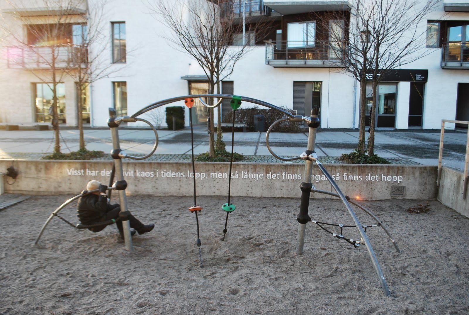 Na tym placu zabaw przez chwilę nie mogłem załapać, dlaczego nie potykam się na żadnym słowie, potem dotarło do mnie, że napis jest po szwedzku, a nie po norwesku. Słowa „Visst har det blivit kaos i tidens lopp, men så länge det finns ungar så finns det hopp” (Pewnie, że w dziejach panował chaos, ale dopóki mamy dzieci, jest nadzieja) pochodzą z piosenki „Żale turysty” Cornelisa Vreeswijka, szwedzkiego pieśniarza holenderskiego pochodzenia (tutaj klip z norweskiej zresztą telewizji).