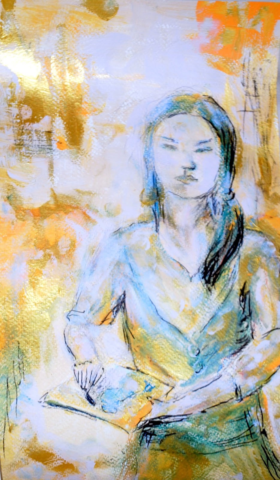 (technika mieszana: akwarela, tusz, złote płatki)