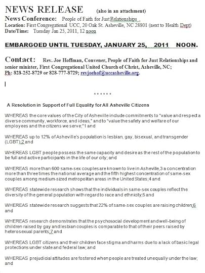 People of Faith for Just Relationships spokesperson, the Rev. Joe Hoffman, explained, "The Resolution's purpose is to stimulate Asheville and City Council to take a leadership role in a statewide effort to recognize the need for equal civil rights, employment rights, and family rights and protection from bullying for LGBT (Lesbian, Gay, Bisexual, and Transgender) citizens."