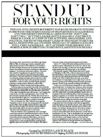 The article is called "Stand Up for Your Rights: activists, organizers and political voices" -- it doesn't appear to be on Interview's web site yet, though portions of the issue are up. The project is the brainchild of photographer David Mushegain and Dustin Lance Black, Academy Award winner for Best Original Screenplay in 2009 for "Milk," and board member of the American Foundation for Equal Rights.