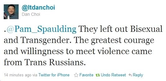 Dan is live-tweeting his arrest in Moscow for demonstrating against the government's cancellation of Pride.Army Lieutenant Dan Choi, outspoken Don't Ask Don't Tell activist, is in Russia this week in solidarity with LGBT activists there, who are defying the recent ban on Moscow pride, scheduled for this Saturday May 28. While activists plan to march in defiance of the ban, the Moscow police have vowed to break up the parade, and religious and Neo-Nazi extremist groups have announced they'll be out in force as well. Dan Choi filmed a short video from in front of the Kremlin, announcing his intention to march with Russian activists, and risk arrest while doing it. Here is that video:Some of the Tweets: