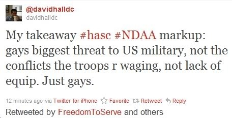 Yes, children, there is no escape from the desire to affirm bigotry. The anti-gay Republicans want a do-over on DADT repeal so badly that they taste it. This time it comes in the form of paranoid, anti-gay amendments to the mark-up of the National Defense Authorization Act (NDAA) during the marathon House Armed Services Committee hearing tonight.David Hall's Tweet pretty much sums it up.