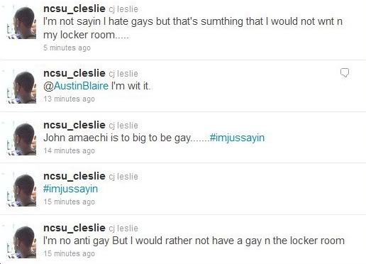 I couldn't wait to hear what John's response was to that last one, lol. As always, John Amaechi is a classy guy --and he knows how to deftly cut right to the chase:I would advise him to listen to the reasoned arguments of people like Brendon Ayanbadejo and educate himself; he has already and will continue to have gay people in his locker room and while he is wondering if they are looking at his genitals, they are focused on taking his minutes and his place in the NBA.Cyd Zeigler also asked NC State assistant athletic director for media relations Annabelle V. Myers for a statement she said that CJ Leslie is not available to comment until after final exams.I have heard quite a few people say we shouldn't be penalising people like this kid and the hockey sports agent for expressing archaic views from a first amendment rights perspective.