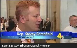 (R-Knoxville; link is to his contact page), is behind a bill, SB49, that would prohibit teachers from discussing the topic of homosexuality with K-8th grade students. It's known as the "Don't Say Gay" bill.Opponents contend that the bill would prohibit teachers from counseling students who may be struggling with homosexuality and preventing any type of bullying that is associated with it. They believe it could increase the suicide rate of gay teens.On the bill specifics, it calls for the state's Board of Education to"The only people who are against it are those who have the goal of pushing that agenda on very young children, so I don't think it's controversial to say, 'We're not going to talk about it. We're going to leave it to the families to decide,'" said Campfield.