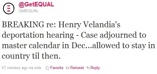 @GetEQUAL: Henry Velandia's deportation hearing - Case adjourned to master calendar in Dec...allowed to stay in country til then.