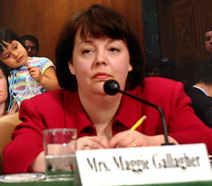 Maggie Gallagher, front woman for the front group of religious institutions that make up the National Organization for Marriage (NOM) came to Capitol Hill on Friday to testify in Support of the Defense of Marriage Act, which bars the Federal Government from recognizing same-sex marriage.