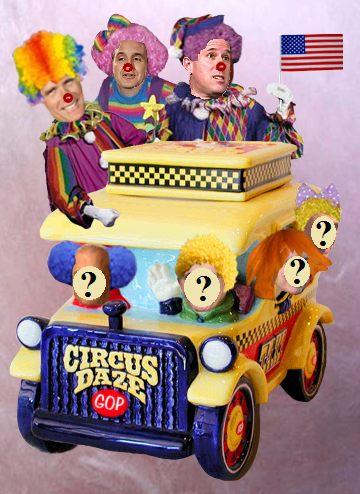 Ah, another occupant in the 2012 GOP Clown Car. It's none other than former Senator Rick "Man on Dog" Santorum, who announced this week that he's formed his Exploratory Committee ("Fighting to Make America America Again). WTF? Here's Faux News's take:"I've been to 25 states over the past year ... and have gotten a lot of great feedback and a lot of encouragement," Santorum said on FOX News Channel's "On The Record with Greta Van Susteren" Wednesday night.Image modified from the original 2008 GOP Clown Car by Liss at ShakeSis ....He reportedly made a little under $100,000 a year at FOX News Channel as an on-air contributor under a three-year contract set to expire in 2013. However, the network suspended the contract last month, citing a conflict of interest as he publicly mulled a presidential run.