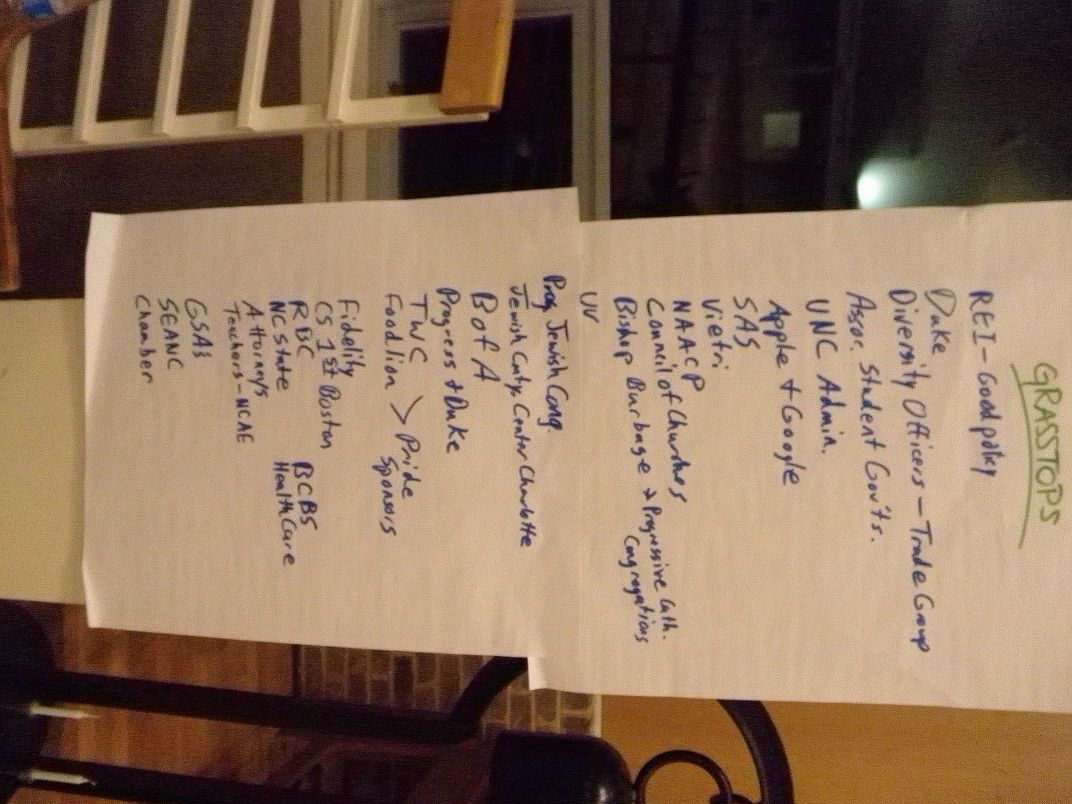 We want to be able to kill the bill by securing the votes of key Dems and Republicans in the House or the Senate. It will take a lot of engagement to make the legislators do the right thing. ENC has a registered lobbyist that works the General Assembly. But the grassroots advocacy is equally important:One person in the audience said that we need to bring forward our kids, day care providers people who see us as families to speak up for equality and against the amendment.* Day of Action