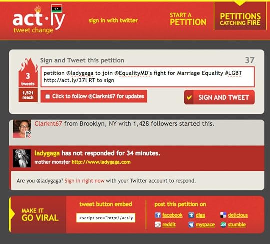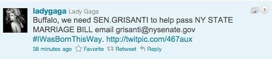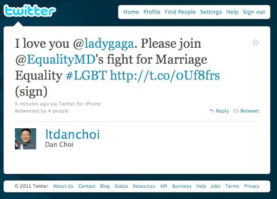 You can go here to retweet it. It tweets the request to her Twitter account and will show up as a mention of her. She has all she needs right there, Equality Maryland's Twitter address. Gaga famously exchanged tweets with Senator Gillibrand during the DADT fight, I trust she can do the same with Equality Maryland.