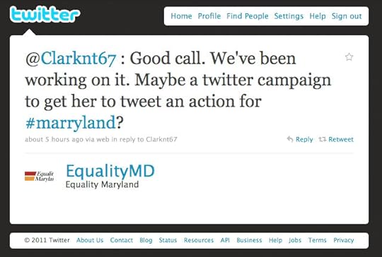 Let's see if we can get her to help Equality Maryland to bring Marriage Equality home this week in the Free State. I actually reached out to Equality Maryland and made the suggestion, they liked it, and sent this reply.