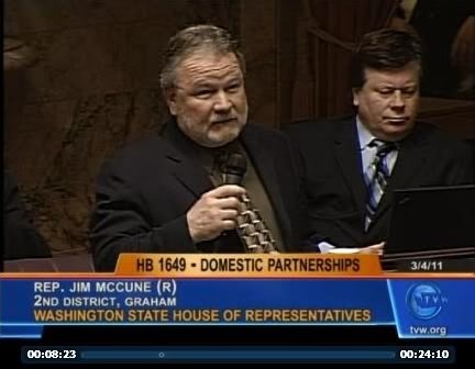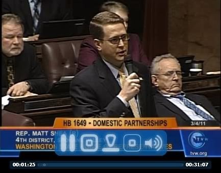 With Rep. Glenn Anderson (R-Fall City) and Rep. Maureen Walsh (R-Walla Walla) breaking ranks with the Republican caucus to vote in favor of the bill along with the entire Democratic delegation, the bill passed handily. But not before some sad attempts by anti-gay Republicans to stop the bill. You can watch the 15-minute debate in the TVW video to the right. A full transcript with commentary is below. It's really too amusing.