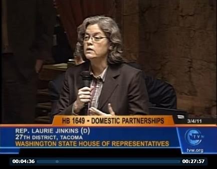 JINKINS: Mr. Speaker this bill is about fairness for all families. Right now there is a hole in the law. And by passing Referndum 71 Washington decided that they wanted all families to be able to protect themselves under Washington state law.The problem is that couples who've decided to use the laws of their states lose those same protections when they come here to Washington. If they were in their own state, they'd be protected. If they were citizens of our state, they'd be protected. It's a flaw in the law. It's a hole we need to fill.