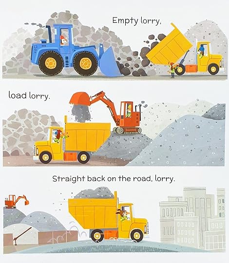 Building on this tongue-twister, Robinson’s rhyme gives a straightforward account of events. For example, the yellow lorry (a dump truck) ’s first mission is to drop off its delivery of boulders and refill it with a new load of shingle: