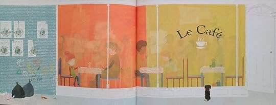 ‘The red scarf [Perdu] wears and the red knitted hat worn by the girl stand out as beacons to connect them throughout most of the book’, notes Just Imagine’s review of the book. Initially, this connection (as with the girl) is easily overlooked. But it adds a subtle layer, and kids will enjoy searching for the little girl in the pictures over subsequent readings.
