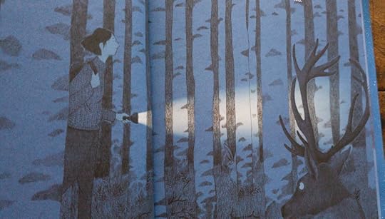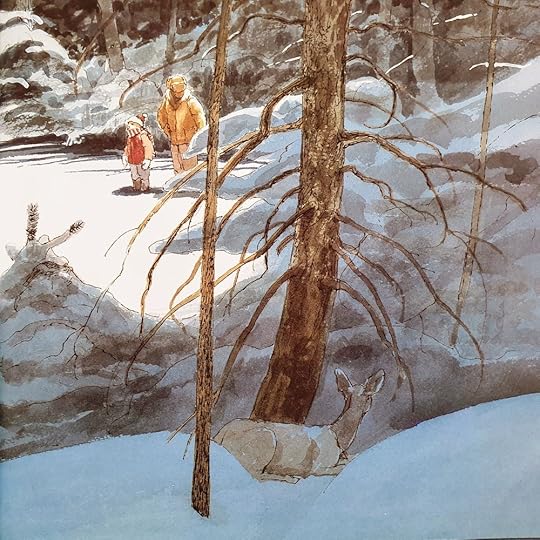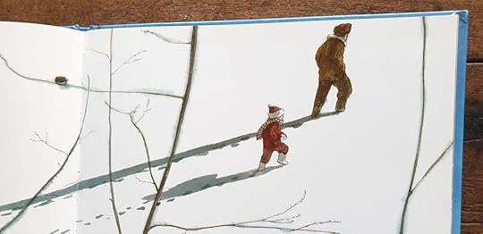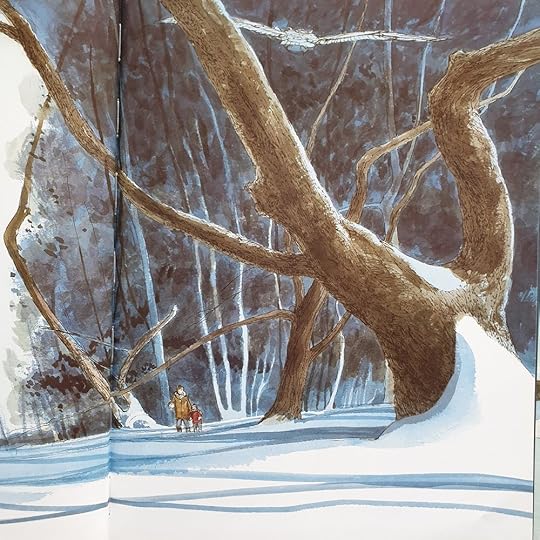Leaving their farmhouse behind, father and daughter head for the dark woods, crunching over crisp snow ‘whiter than the milk in a cereal bowl.’