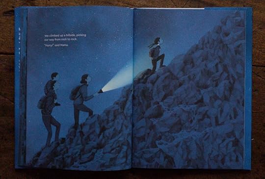 The forest opens up on a lake, where the kids (using Dad's flashlight) play with the moon's reflection. They lie together on the grass and gasp 'at the vast, glittering sky' where they stay, ‘until Papa [says], "Let's push on. We need to keep walking, so we get there on time."