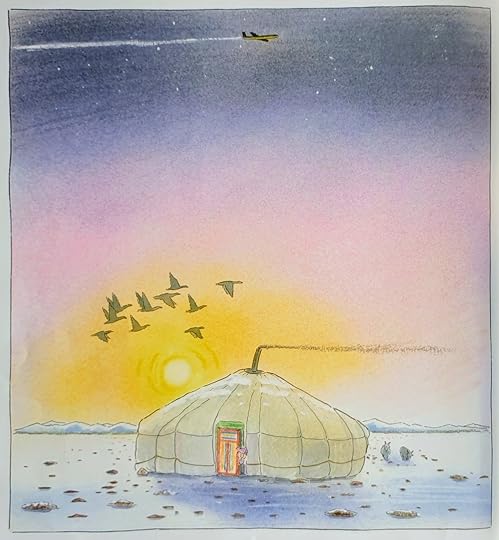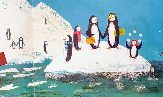 Despite being bundled in warm clothes, our narrator describes the feel of the cold – ‘as if someone’s icy hand was palm-down on my back.’ The descriptions are beautiful and poetic – yet feel appropriate for the child.