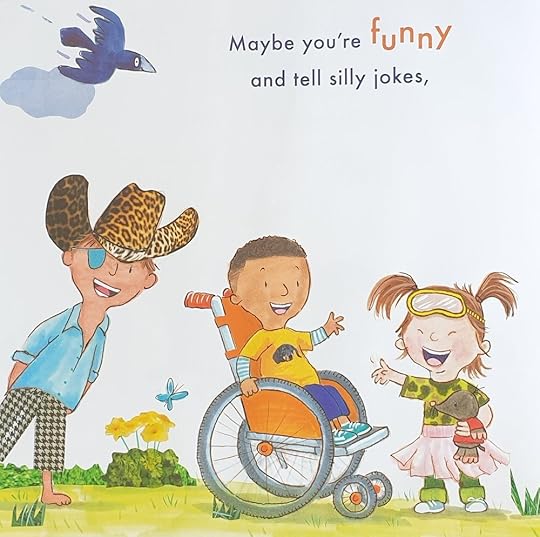 In hindsight, I’m glad. The character was used to illustrate the line, Maybe you’re funny and tell silly jokes. It was a wise choice since it refers to a personality trait, thus acknowledging the kid as an individual rather than defining them by their disability. (For the record, yes – wheelchairs are tricky to draw!)