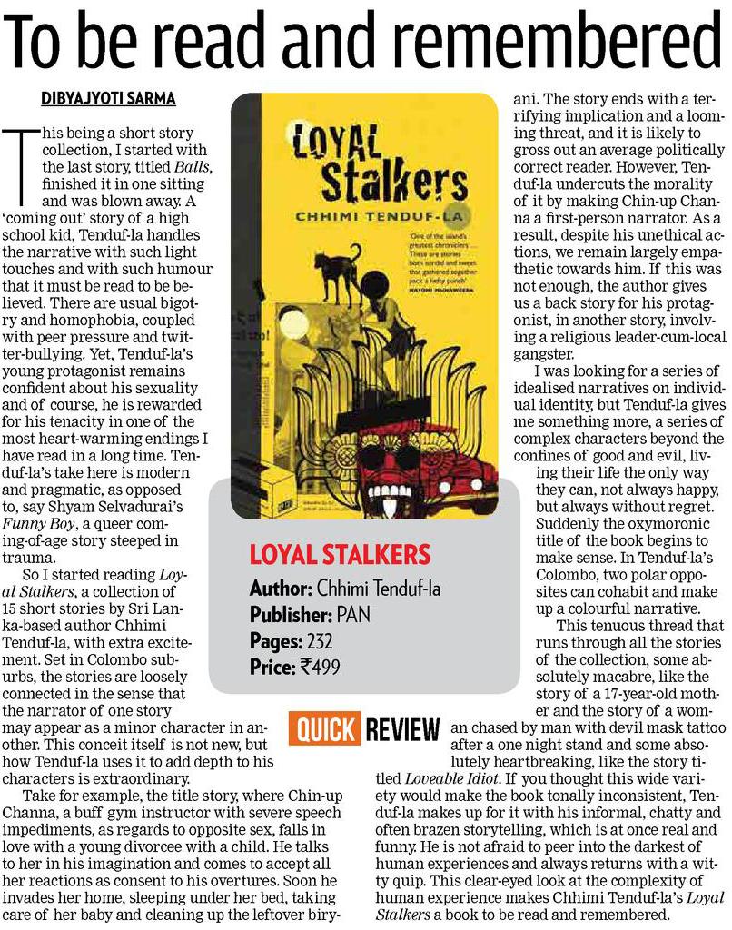 So I started reading Loyal Stalkers, a collection of 15 short stories by Sri Lanka-based author Chhimi Tenduf-la, with extra-excitement. Set in Colombo suburbs, the stories are loosely connected in the sense that the narrator of one story may appear as a minor character in another. This conceit itself is not new, but how Tenduf-la uses it to add depth of his characters is extraordinary.