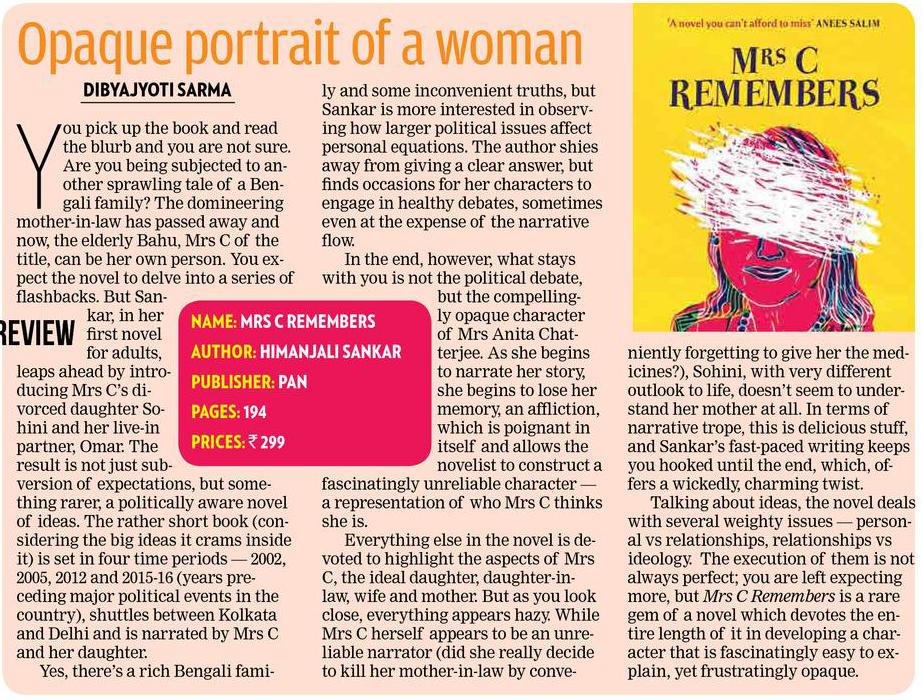 Himanjali Sankar’s new novel Mrs C Remembers has been pra...