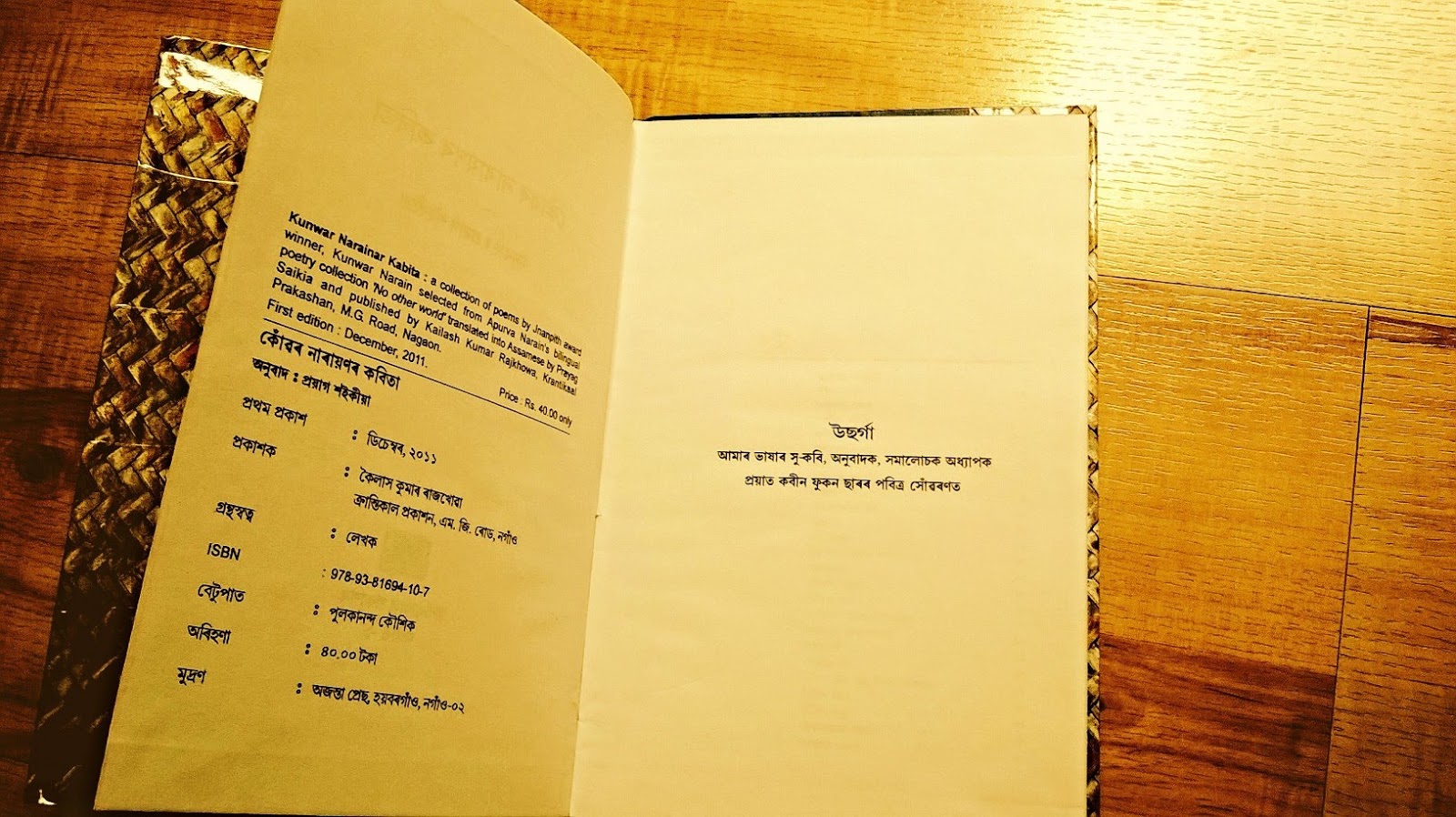 On the occasion of the 89th birthday of the doyen of Hindi poetry, the Master, Kunwar Narain, this is a treasure I discovered at the poet’s CR Park residence the other day – a selection of Kunwar Narain’s poems in Assamese translation. The book, Kunwar Narain-r Kabita, has been translated by Prayag Saikia and has been published by Krantikal Prakashan, Nagaon in 2011. It was a matter of personal pride to have discovered the book at the residence of poet. As someone who has read Kunwar Narain’s poems both in original Hindi and English translations, and has heard the poet read his own work, I can vouch for the Assamese translation – they are indeed very good. Do read!