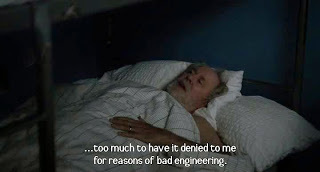 Then fadeout, and Coop is rescued and he is on a space station orbiting Saturn (with a scene which is a nice homage to Inception’s weird dream), and he meets his old and dying daughter. And, then, the daughter urges the father to go meet Dr Brand, still young, in a different galaxy. Because, she says, “A parent shouldn't have to watch their own child die.”