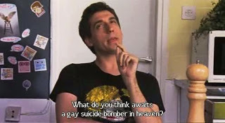 Here, a gay man discusses the afterlife of Palestinian suicide bombers. “What do you think awaits a gay suicide bomber in heaven? Seventy virgin twinks or seventy muscled hunks? Think he can choose?”