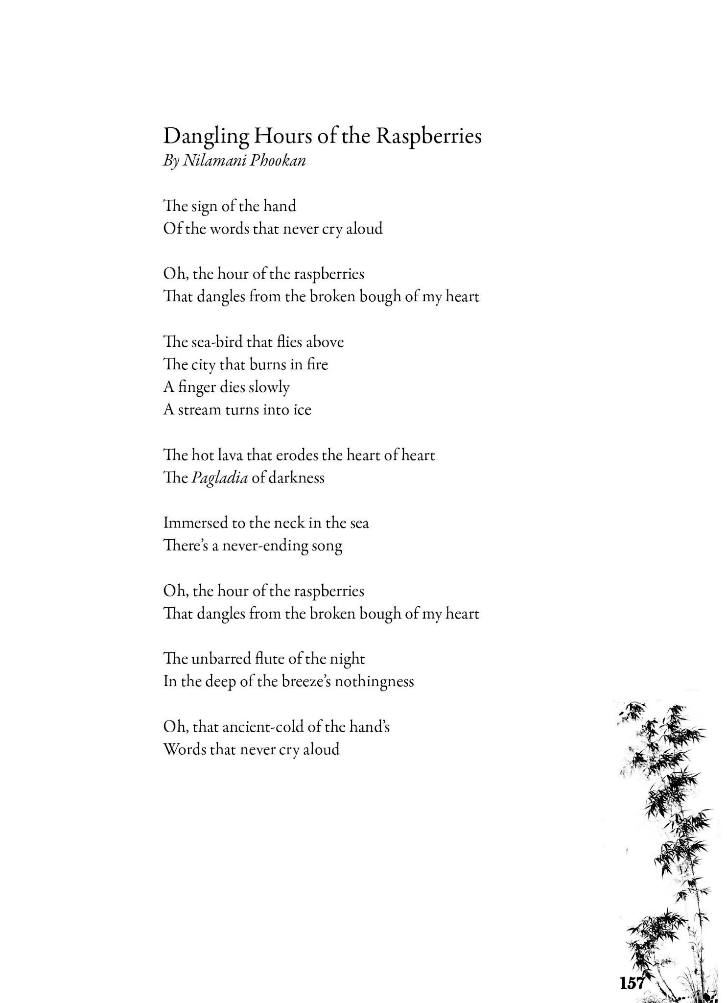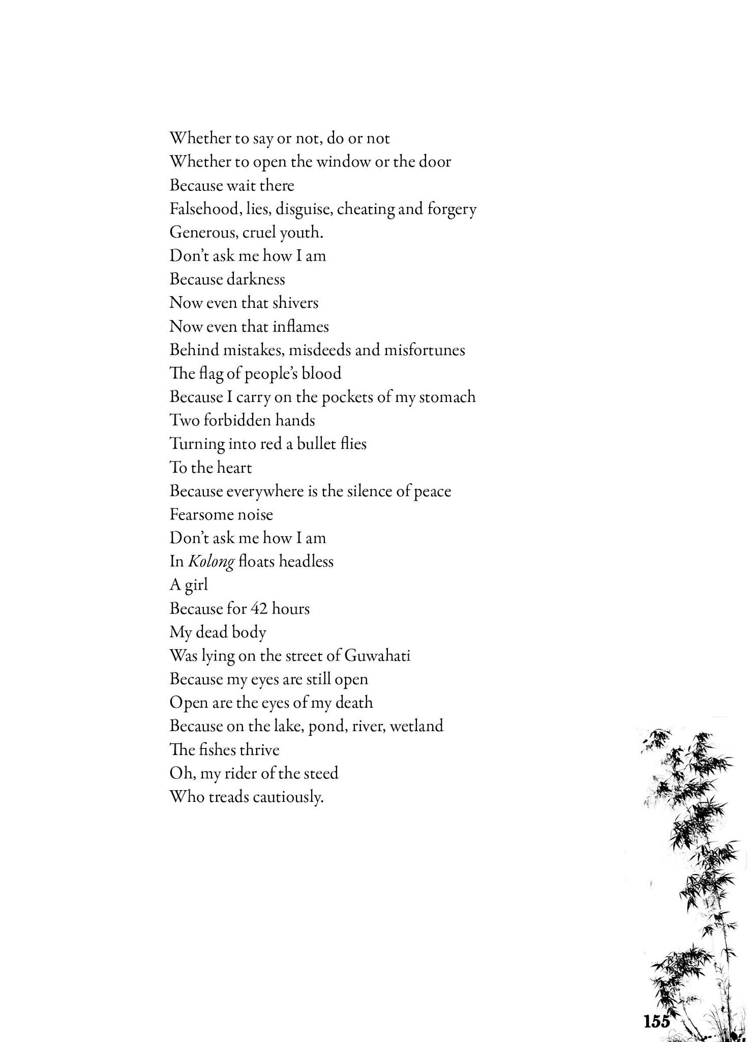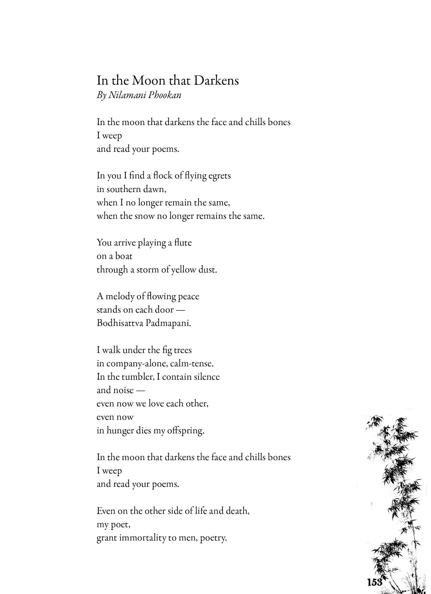 Considered to be the foremost modernist poet in modern Assamese poetry, the hallmark of Nilamani Phookan’s poetry is condensed themes expressed in economy of words. His collection of poems Golapi Jamur Lagna (Hour of the Raspberries) is considered to be a milestone which inspired a generation of poets. The density of theme makes it almost impossible to translate and paraphrase his poetry. He received the Sahitya Akademi awards in 1982 and Padmashree in 1990. His other volumes of poetry include Surya Heno Nami Ahe Ei Nadiyedi (The sun is said to descend by this river, 1963), Nirjanatar Sabda (Words of Solitude, 1965), Phuli Thaka Suryamukhi Phultor Pine (Towards the Blooming Sunflower, 1971), Nrityarata Prithibi (Dancing Earth, 1985), and Kabita (Poems, 2001). He has also translated into Assamese a collection of Japanese poetry, and also the poems of Spanish poet Federico Garcia Lorca. He worked as a teacher of history in a college in Guwahati.