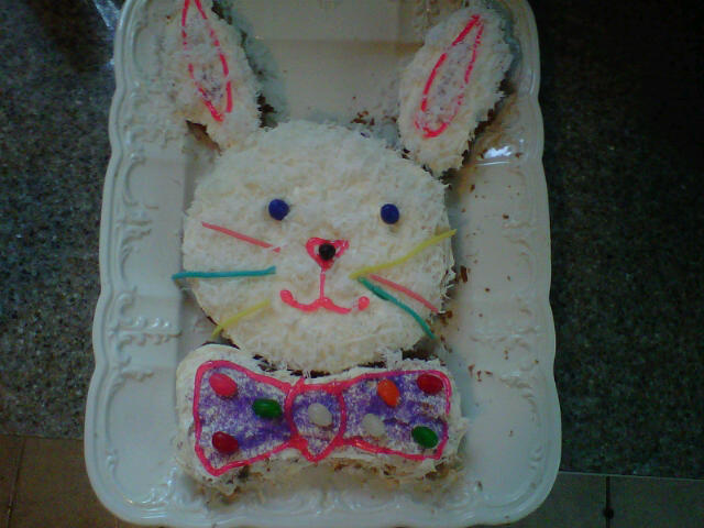Busy Spring---need to post more soon. But wanted to take a minute and post the pic of our homemade bunny cake from today. This is a classic that my husband grew up on, but I had never made it before. Make two 9 inch rounds of a cake of your choice (we used CARROT). One round is the bunny head, the other round os cut int three pieces..the sides are cut into bunny ear pices and the middle is his bow tie. Ice with the frosting of your choice. Add coconut shavings for fur, draw a nose/mouth and outline of ears and bowtie with gel or decorator frosting, jellybeans for eyes, licorice for whiskers and voila! A bunny!