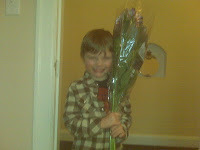 Sunday was my fortiesh birthday. Little man woke me up first thing in the morning very excited. He and his dad brought me purple flowers and he was very proud to hand them to me.