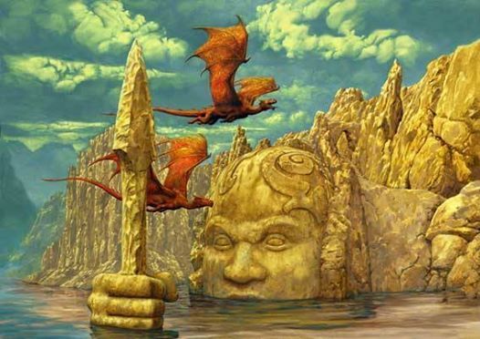What is the story here? Dragons skimming a submerged statue -- a lost civilisation? Dragons now ruling over a dead planet? That's a little like the tale of my dragons in Prophecy of the Kings. Are the dragons forlorn? The lead one seems to be calling out. Is there a significance of the dragons being red? Are there blue dragons nearby and what would that lead to?? Why the flood water?