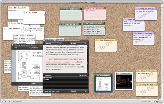It also has places for reference material, in the form of photos or articles or just about anything. You can keep them right there in the program to refer to them at any point during your writing, but they won't be counted among or mess with your actual manuscript. It's pretty neat.